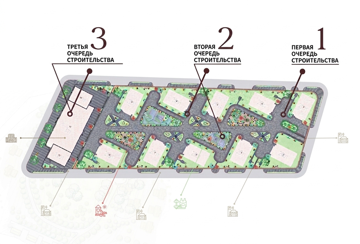 Дворовая территория комплекса спроектирована так, чтобы полностью исключить движение автомобилей. Это создает пространство для спокойного отдыха и безопасных прогулок, где дети могут играть, а взрослые наслаждаться временем на свежем воздухе, не переживая о движении машин.