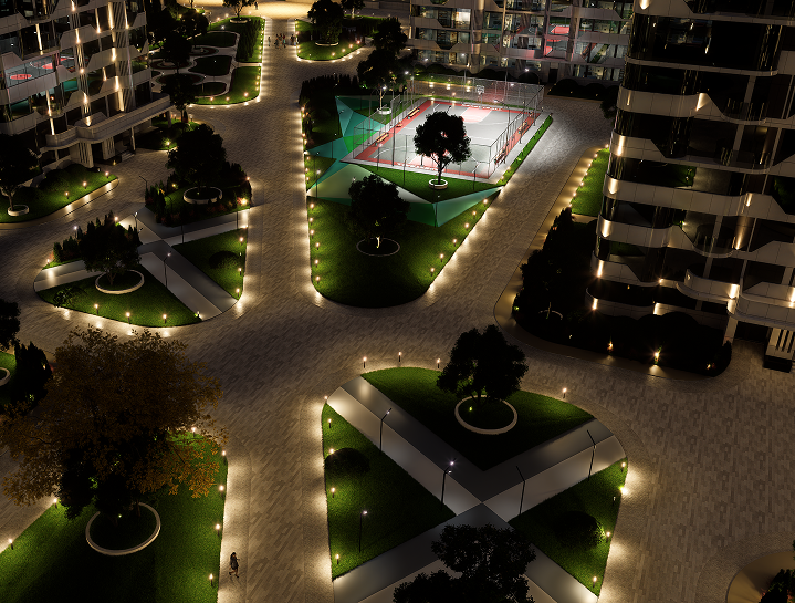 Дворовая территория комплекса спроектирована так, чтобы полностью исключить движение автомобилей. Это создает пространство для спокойного отдыха и безопасных прогулок, где дети могут играть, а взрослые наслаждаться временем на свежем воздухе, не переживая о движении машин.